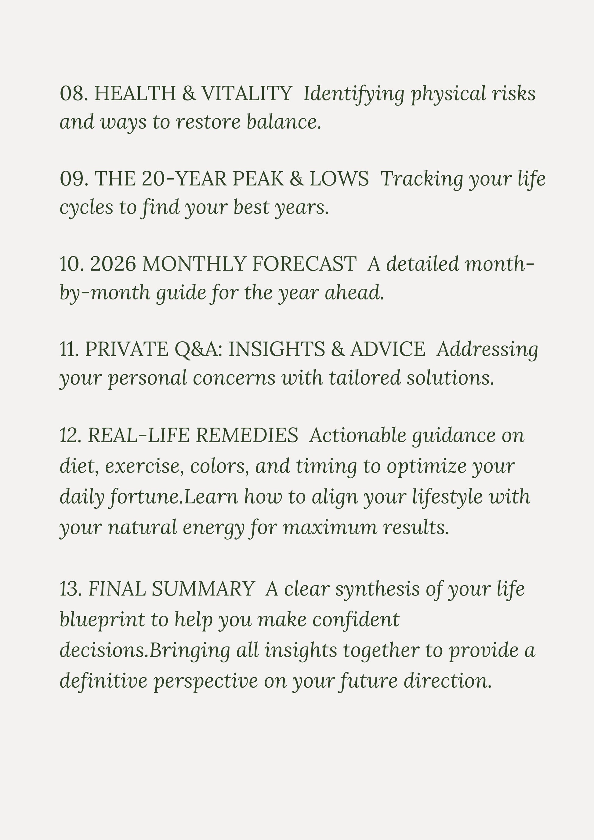 | Life Timing Cycles | ✔️ Next 20 years of primary timing rhythm (two key ten-year cycles) | ✔️ 70-year life timing cycle; the full trajectory of life timing |